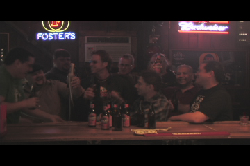 04-27-08 On April 27, almost a year after our initial shoot at Hansil's Bar & Grill in Oakland, NJ, we had a very special reunion shoot for one of our most entertaining shoots ever. The first time we visited Hansil's, our team left with some invaluable unexpected footage wherein Artie met Tommy, Keith, Bob, Oliver, Jonathan Jim, Mr. Hansil and the rest of the "Secure Location Bar" Gang! This time, we were joined by many of our original actors but also by members of Flip the Bird, to tie in their performance to Artie's brawl in the "Secure Location Bar." There certainly was an element of magic in the air, for all the boys got right back into character with their own rowdy rendition of a timeless and classic drinking song and did not fail to raise the roof with their comic hijinks! Hansil's Tavern & Grill 7 Ramapo Valley Road Oakland, NJ 07436