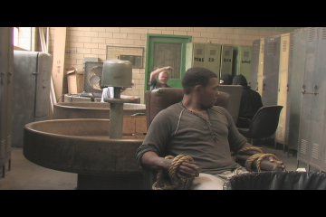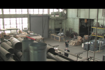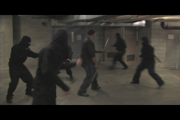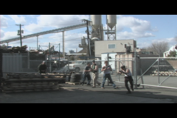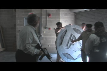 03-15-08 Our cast and crew converged on the scene at 8:30am and spent all day shooting action sequences in a machine shop and manufacturing facility. It was decided that Xiongmao's fortress should have some kind of manufacturing plant as a part his Jian Chi Trading Company, being that he is hellbent on world domination and would likely be in the business of arms production. This shoot involved scenes taking place at Xiongmao's fortress, including a scene where Rachel Gehret escapes captivity and then is recaptured by Victoria, scenes from the final battle in which all of our heroes stormed the complex, and a daring rescue attempt carried out by Agent Dixon, Jim, G and Artie after making their way through the forest and intot he complex. The first picture is a screenshot of Rachel Gehret as she is witnessing the resurrection of Commander Mitternacht by Xiongmao and about to be recaptured by Victoria (seen in the background). The second picture is a screenshot of Artie Bannister, followed by the members of FLIP THE BIRD as they approach a rear entrance to the complex - READY FOR BATTLE! The third picture is a picture of our heroes (Jim, G, Dixon and Artie), sneaking across the machine shop floor as they narrowly avoid a group of ninjas on their way to rescue Ms. Gehret. Little do they know, that they are being watched via closed circuit television monitors by Diego deCasthillos, a Brazilian double agent who works for Xiongmao, but who is ultimately working for the Brazilian government to help stop the Panda Syndicate. Special thanks to all our cast and crew, Gerson Feiner of P. Feiner and Sons, Inc. and, especially, our ninja crew for making this shoot so fantastic!